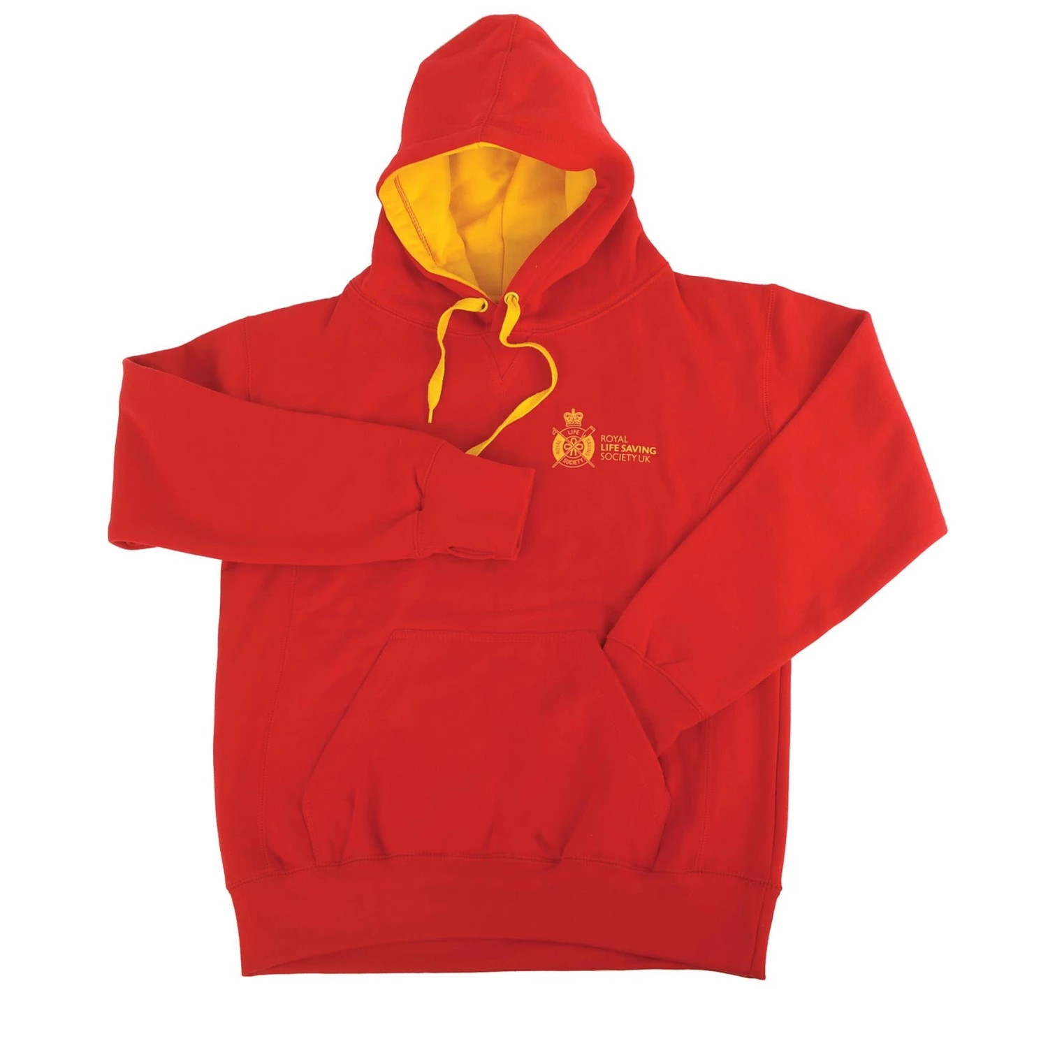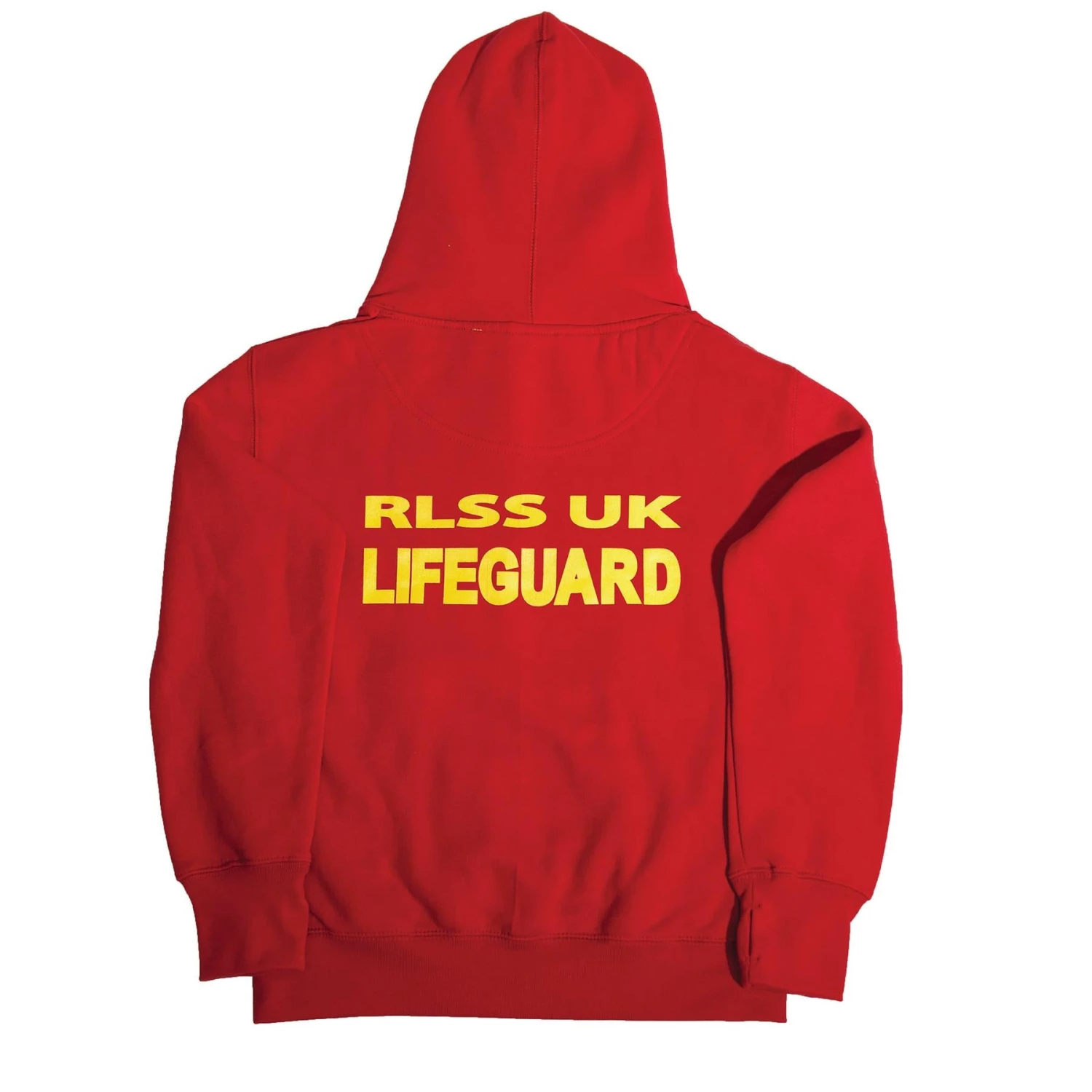 Unisex RLSS UK Lifeguard hoodie in red with contrasting yellow fabric inside the hood.